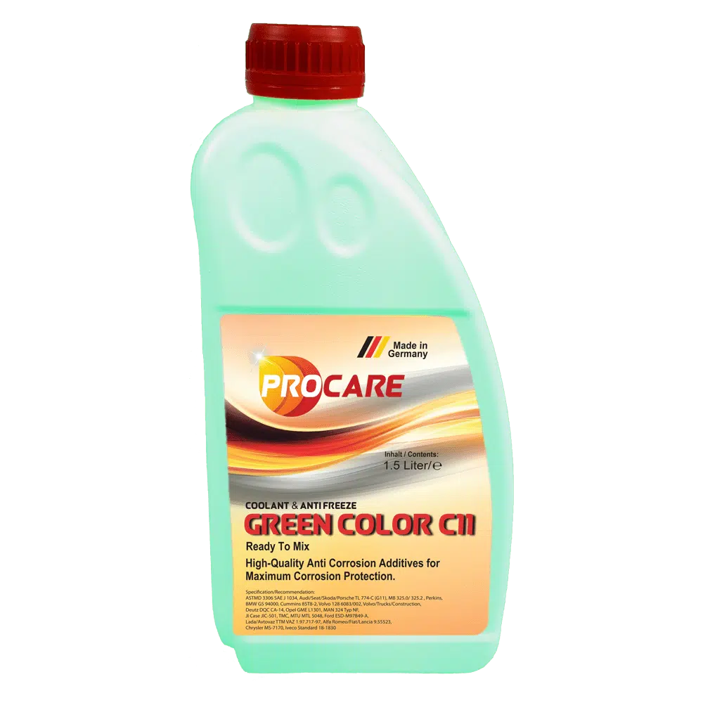 Procare Coolant C 11-ist ein Kühlerschutzmittel auf Basis Ethylenglykol. Es ist frei von Aminen, Nitriten und Phosphaten. Mit seinem speziellen Inhibitorenpaket schützt es den Motor und den Kühlkreislauf hervorragend vor Frost, Rost und Überhitzung. Es ist auch für Leichtmetall-Motoren geeignet.